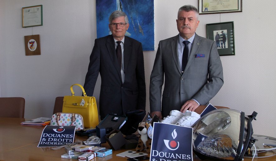 Thierry Marcellin, adjoint au directeur des douanes de Provence et le directeur Jean-Marc Coquio, devant des objets saisis par les agents de cette très active direction. Photos david rossi