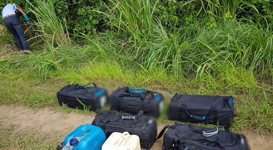 Cinco maletines localizados este lunes en una finca en Ortega de Santa Cruz, Guanacaste, escondían 150 kilos de cocaína.