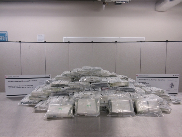 Dans l’Ouest du pays, en Colombie-Britannique, l’Agence des services frontaliers du Canada (ASFC) a annoncé aujourd’hui qu’elle a procédé à la saisie de 107,5 kg de cocaïne présumée à la frontière de Pacific Highway.