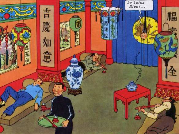 Tintin qui entre dans un salon d’opium dans Le Lotus Bleu