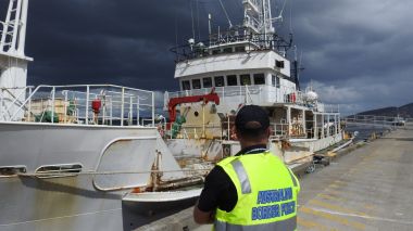 The former whaling boat, Kaiyo Maru No.8, after docking in Hobart