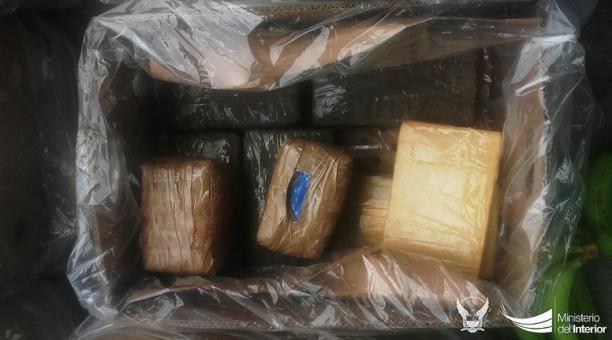 En la denominada operación « Camaleón » se encontraron 336 paquetes rectangulares, recubiertos con cinta adhesiva, escondidos en las cajas de banano de exportación. Foto: Twitter @MinInteriorEc