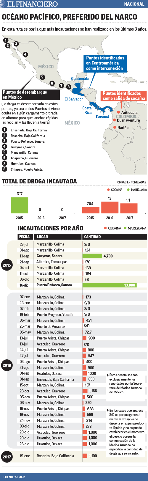 CIUDAD DE MÉXICO.- La ruta marítima del Pacífico fue en 2016 una de las más utilizadas por los grupos del narcotráfico para acarrear la cocaína proveniente de Sudamérica y llevarla, a través de Centroamérica y México, a Estados Unidos.