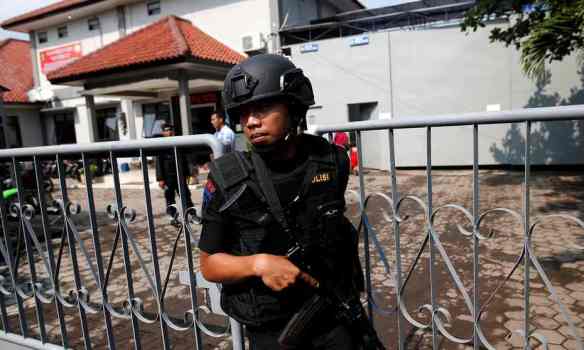 An armed police officer outside the gate to the ferry port for the prison island of Nusa Kambangan. Photograph: Darren Whiteside/Reuters