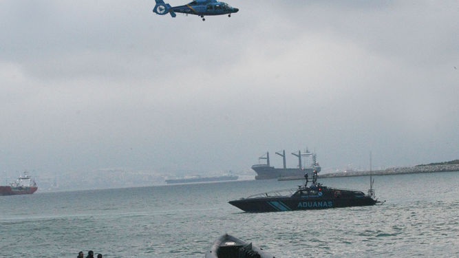 Una embarcación de Vigilancia Aduanera junto a un helicóptero de la Agencia Tributaria, en una operación contra el narcotráfico en La Línea. / paco guerrero