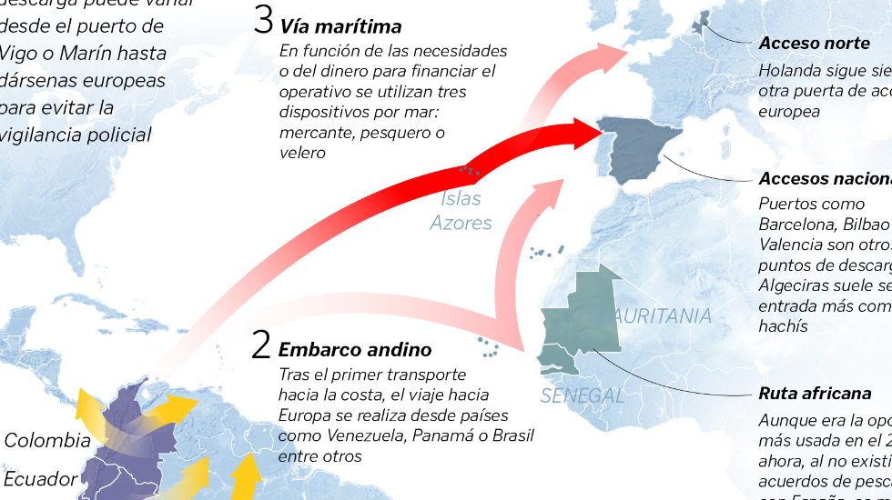 Los tiempos pasan, los rostros cambian, las tecnologías avanzan, pero los sistemas de introducción de la cocaína a través del litoral pontevedrés siguen sin apenas cambios. Y es que ya lo reseñaba el anterior fiscal antidroga provincial, Luis Uriarte, cuando afirmaba que la provincia de Pontevedra «se revelaría como una de las vías de entrada de cocaína en nuestro país que, una vez dentro del territorio gallego, sería después distribuida a otras regiones». Como contrapartida, las Rías Baixas ejercerían, en el caso del hachís y otros estupefacientes, como «un receptor más de las partidas introducidas en España a través de otros lugares».