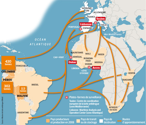 AFRIQUE (cocaïne): le Cap-Vert, la Guinée Bissau, le Ghana, le Togo, le Sénégal et la Gambie sont utilisés comme « relais » dans la logistique des narcos