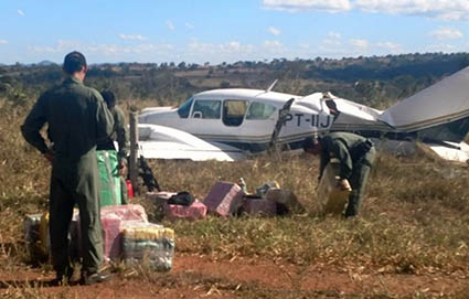 Une propriété située dans a région d’Aragarcas, dans l’état de Goiás. L’appareil avait été auparavant survolé par un Tucano A-29 de la force aérienne brésilienne qui le voyant s’apprêter à décoller, avait tiré devant lui une rafale pour intimider ses occupants. A bord, une fois l’avion (rudement) posé un peu plus loin dans la municipalité rurale de Jussara, les militaires découvriront plus d’une demi-tonne de cocaïne à son bord (653 kilos au total). Sur l’infographie de la presse brésilienne on a pris quelques libertés avec la réalité : l’avion des trafiquants ressemble plutôt à un Cessna Centurion et n’a pas volé très loin en faite de l’endroit d’où il avait décollé.
