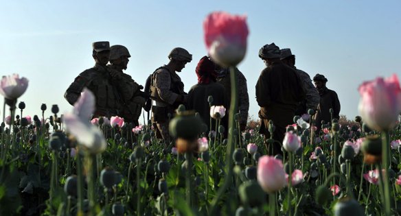 In this 21st century Opium War, crops harvested in Afghanistan are essentially feeding the heroin market not only in Russia and Iran but especially in the US. Up to 93% of the world’s opium comes from Afghanistan. Contrary to predominant Western perception, this is not an Afghan Taliban operation. The key questions — never asked by Atlanticist circles — are who buys the opium harvests; refines them into heroin; controls the export routes; and then sell them for humongous profit compared to what the Taliban have locally imposed in taxes. US Marines and Gunnary Sergeant Nate Cosby (R), Staff Sergeant Josh Lacey (2nd R) and Navy Hospitalman 2 Daniel Holmberg (L) from Border Adviser Team (BAT) and Explosive Ordance Disposal (EOD) 1st and 2nd Marine Division (Forward) walk through opium poppy field at Maranjan village in Helmand province on April 25, 2011 as they take patrol with their team and Afghanistan National Police.