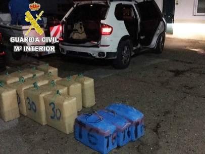 En total los agentes se han incautado de 83 fardos de hachís, con un peso bruto aproximado de 2.500 kilogramos, de los que 19 se encontraban en un vehículo, 20 en otro y 44 junto a una de las paredes del garaje.