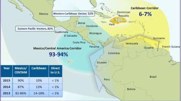 La DEA, la agencia antinarcóticos estadounidense, también está atenta al papel de intermediario que juega el narco-estado venezolano, que ayuda a sacar la droga de la vecina Colombia y la dirige bien hacia Centroamérica y México, sobre todo en avionetas, bien hacia la Republica Dominicana y otras islas del Caribe, especialmente en lanchas.