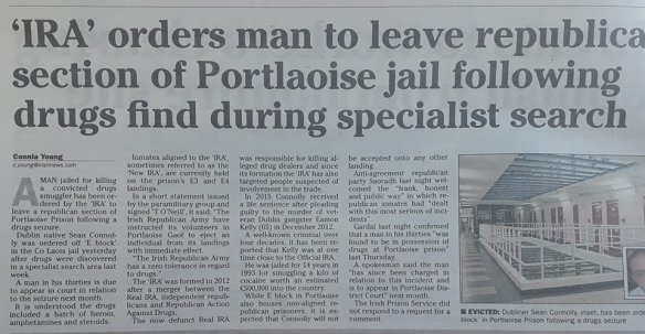 Dans une courte déclaration émise par le groupe paramilitaire et signée « T O’Neill », il est écrit : « L’armée républicaine irlandaise a ordonné à ses volontaires de Portlaoise Gaol d’éjecter un individu de ses quartiers avec effet immédiat . L’armée républicaine irlandaise a une tolérance zéro à l’égard de la drogue.»
