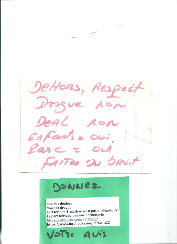 Les dealers qui opéraient préalablement rue Sonia Delaunay, à 200 m de là, avaient préféré partir suite à la pose de caméras ainsi que le murage de caves de logements sociaux….et avaient décidé de s’installer dans le parc municipal de « Kérizac ».