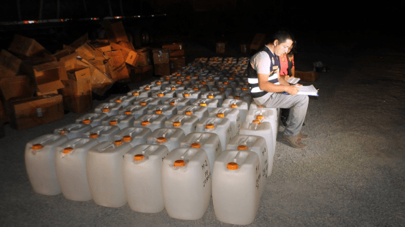 Un total de 90 bidones de acetona, insumo que es empleado para elaborar clorhidarto de cocaína, fue decomisado por el Ministerio Público y la Policía Nacional del Perú.
