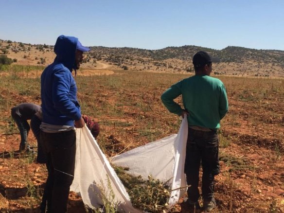 Munis de bâches blanches, les femmes aux habits multicolores, les hommes et les enfants se mettent à l’œuvre, ramassant à même le sol les épis de cannabis, coupés la semaine dernière et qui sèchent au soleil. Séchés, ces plants serviront à la fabrication de la résine de cannabis.