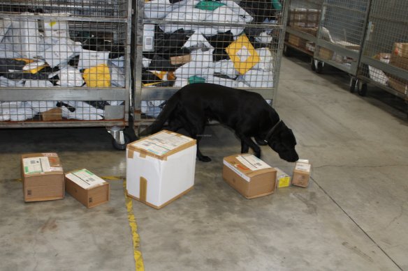 Quatre douaniers et Hebo, leur labrador spécialisé …