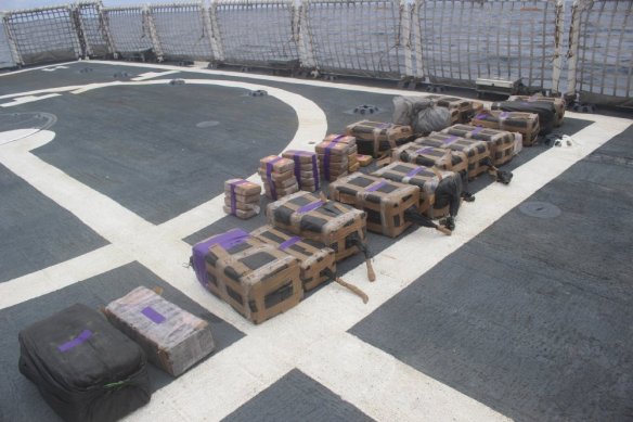 Bales of cocaine seized from a suspected smuggling vessel lie on the deck of the U.S. Coast Guard Cutter Valiant in September.