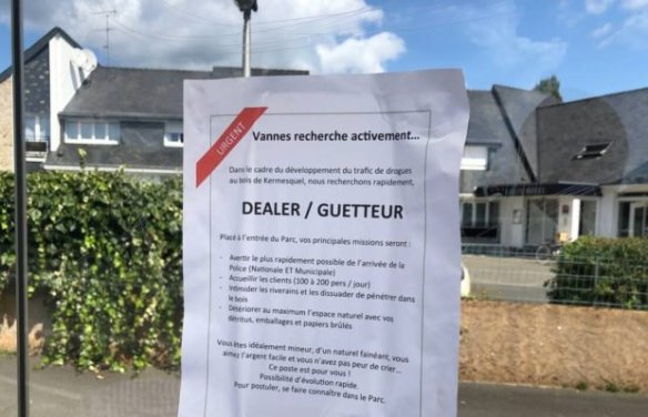 C’est le contenu gentiment provocateur de l’annonce affichée, samedi matin, dans plusieurs arrêts de bus de Vannes (Morbihan). Si elle n’est pas signée, elle ne provient pas des trafiquants, qui n’ont pas besoin de petites annonces pour recruter, mais des riverains du parc, qui multiplient les actions depuis mars pour faire cesser ce trafic qui les prive de leur bois.