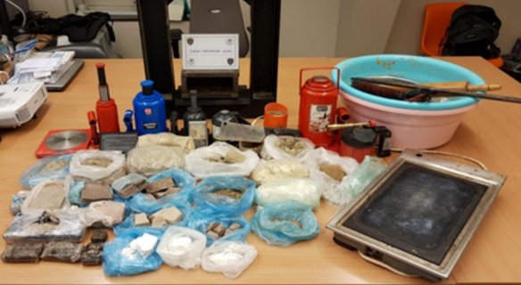 Lors de la perquisition effectuée dans l’appartement occupé par les suspects, les enquêteurs ont saisi 215 grammes de cocaïne, 2,6 kg d’héroïne, près de 4,5 kg de produits de coupe, un peu de haschich, plusieurs balances de précision et du matériel servant au conditionnement des stupéfiants.
