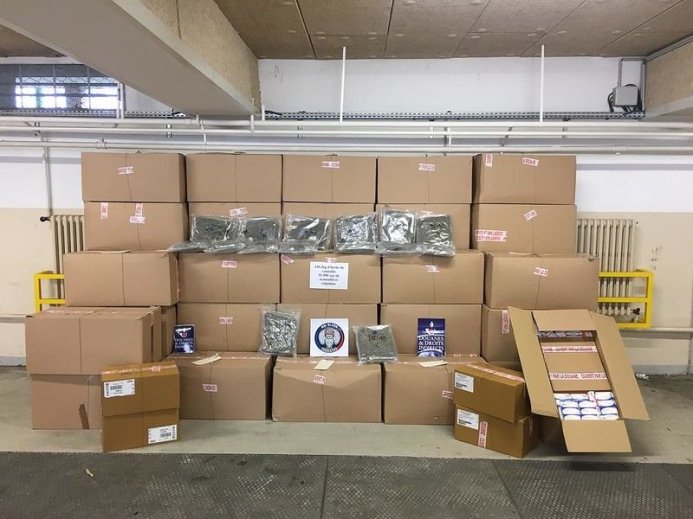 Lors du déchargement complet, « 44 cartons contenant sachets d’herbe de cannabis » ont été découverts « pour un total de 438 kg et huit cartons contenant des boîtes de médicaments, un antalgique et un somnifère, également connus pour leurs effets psychotropes, soit environ 65 kg. » Selon le communiqué, ces marchandises étaient répartis au milieu de cartons d’articles sans valeur, tels que « des assiettes cassés« .
