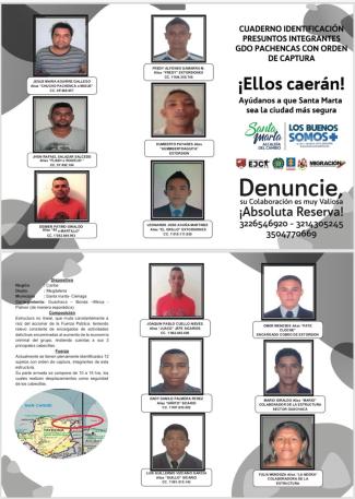 En février 2019, les autorités avaient demandé de l’aide pour savoir où se trouvaient les 12 criminels les plus recherchés de «Los Pachenca» à Santa Marta. Ces individus sont: Jesús María Aguirre Gallego, alias ‘Chucho pachenca’ o ‘Migue’; Freddy Alfonso Gamarra, alias ‘Freddy’; Jhon Rafael Salazar Salcedo, alias ‘Flash o Rogelio’; Humberto Payares, alias ‘Humbertoaguita’; Deimer Patiño Giraldo, alias ’80 o Martillo’; Leonardo José Acuña Martínez, alias ‘Grillo’; Joaquín Pablo Cuello Nieves, alias ‘Juaco’; Omar Meneses, alias ‘Pata e’ cloche’; Dady Danilo Palmera Pérez, alias ‘Niñito’; Mario Giraldo, alias ‘Mario’; Luis Guillermo Vizcaíno García, alias ‘Guillo’ y Yulis Mendoza, alias ‘La Negra’.