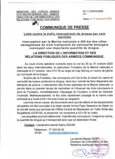 Au cours d’une opération conduite dans la nuit du 30 au 31 octobre 2020 dans les eaux internationales, le patrouilleur « Le Fouladou » de la marine nationale a intercepté le 30 octobre vers 01h30 au large de Cap Skirring un navire de pêche qui convoyait de la drogue.