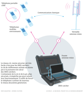 La loi autorise la collecte de données par des réquisitions classiques aux opérateurs ou l’utilisation d’« IMSI-catcher », des bornes relais portatives qui interceptent les communications, mais elle interdit le détournement de 100 % du flux transitant par un serveur.