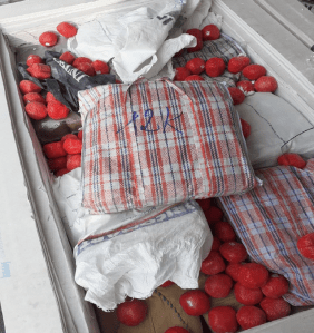 La fouille approfondie de la remorque a permis la découverte de résine de cannabis conditionnée dans des valises marocaines, des films plastiques rouges en forme de tomates et des sacs thermosoudés. Les contenants étaient disposés dans des parties évidées de deux palettes de plaques de plâtre type BA13.