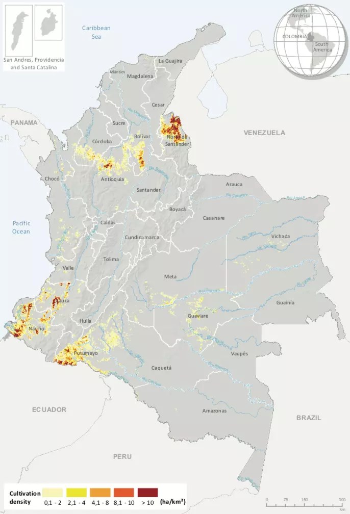 Densidad de los cultivos de coca en Colombia en el 2019. Cinco departamentos concentran alrededor del 84 % de los cultivos del país: Norte de Santander (fronterizo con Venezuela), Nariño, Putumayo (fronterizos con Ecuador), Cauca y Antioquia. © UNODC