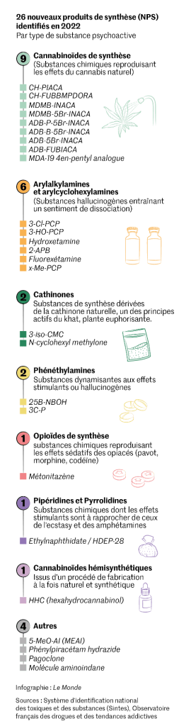 Au total, vingt-six substances de synthèse ont été identifiées pour la première fois en France, en 2022, par le système d’identification national des toxiques et des substances (Sintes) publié mercredi 31 janvier par l’Observatoire français des drogues et des tendances addictives (OFDT).