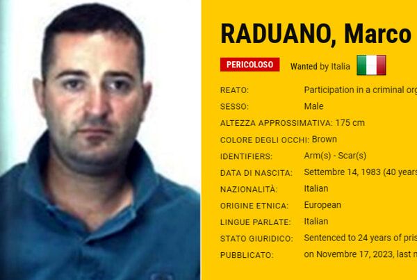 Marco Raduano était recherché depuis son évasion en février 2023 d’une prison de haute-sécurité de Sardaigne, où il purgeait une peine de 24 ans de prison. Europol assure que « le profil criminel de Raduano est particulièrement important », puisqu’il est « au sommet de l’organisation criminelle qui opère dans la région de Gargano », au sud de l’Italie. Europol le décrit comme ayant le rôle de « promoteur, d’organisateur, et de tueur sans pitié de ce groupe dédié à la perpétuation de meurtres, au trafic de drogues, et à la gestion du racket ».
