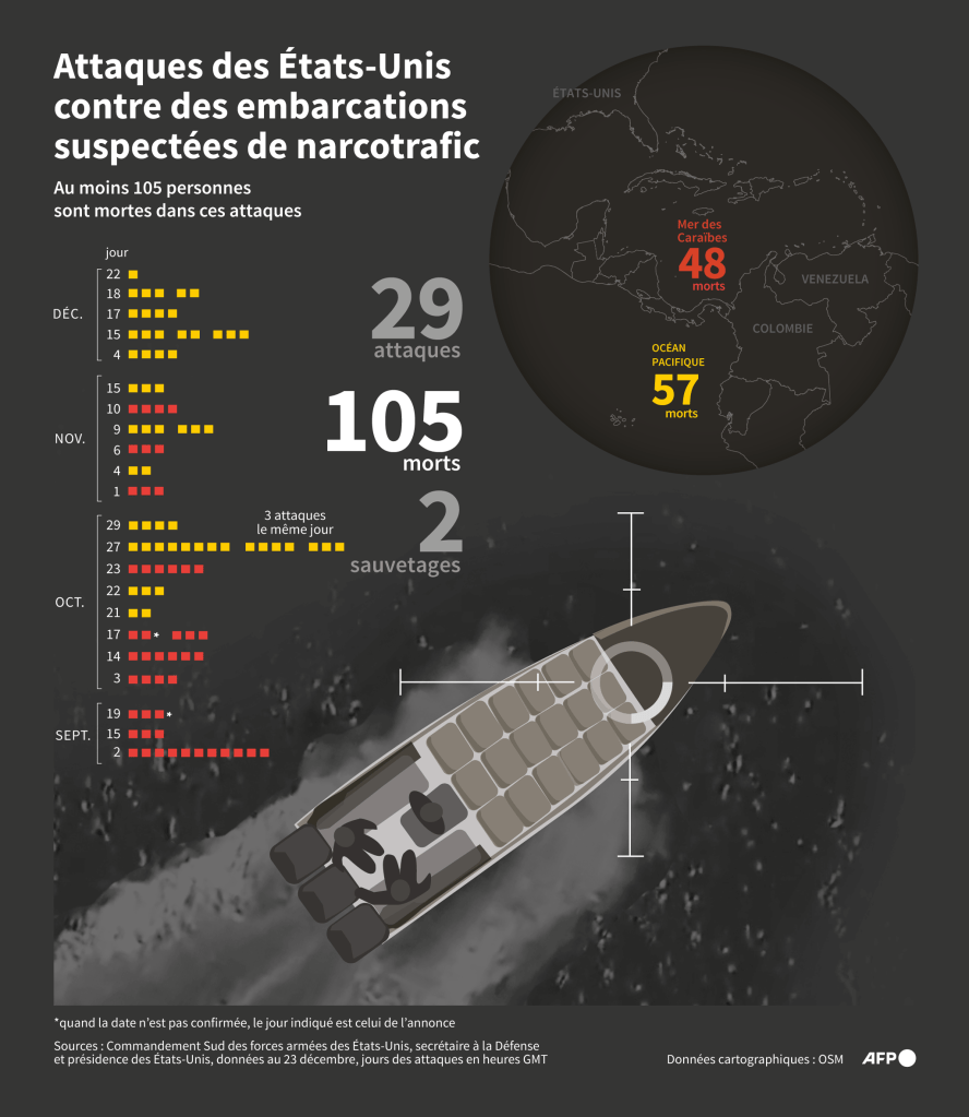 Les États-Unis ont mené une trentaine d’attaques depuis le mois de septembre, tuant une centaine d’occupants. Ces frappes, hors de tout cadre légal, ont suscité de vives critiques de la part des observateurs internationaux