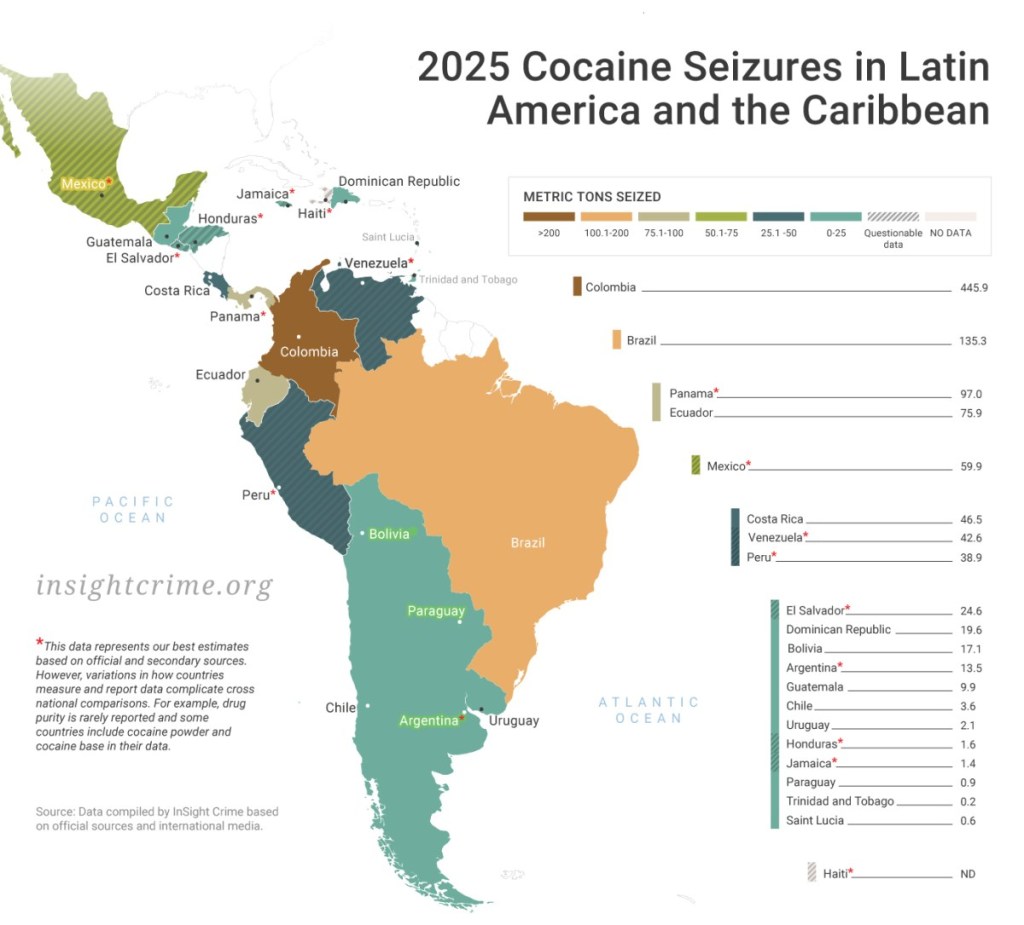 InSight Crime’s 2025 Cocaine Seizure Round-Up reveals a fast-evolving global market. Roughly half of the countries in Latin America and the Caribbean increased their cocaine seizures. The other half saw them fall as trafficking routes shifted in response to new international interdiction strategies.