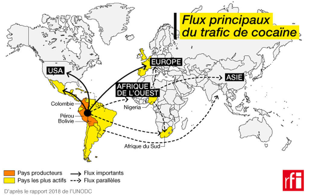 Et la drogue qui continuait d’arriver, via ce trajet, notamment par voiliers : « retour sur la Highway 10, la route de la cocaïne qui lie l’Amérique du Sud à l’Europe via l’Afrique de l’Ouest ».
