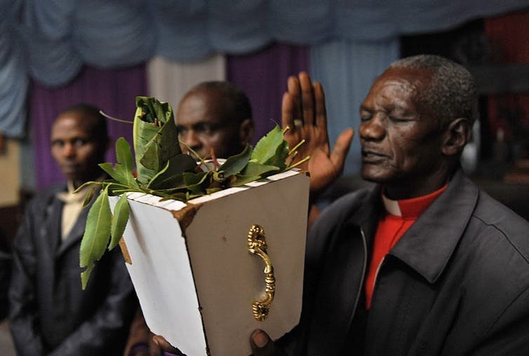 L’évèque Stanley Karuru offre des prières devant une botte de khat à l’église AIPCEA à Igembe (Kenya) pays particulièrement touché par l’interdiction d’exportation de khat au Royaume-Uni en 2014. Tony Karumba/AFP