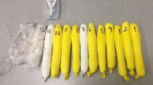 Un nouveau passage à l’appareil à rayons X a confirmé que le flacon ne contenait pas que du liquide. Douze boudins conditionnés avec du ballon de baudruche et du film alimentaire ont été extraits du flacon. Ils contenaient tous de la poudre blanche qui a réagi positivement au test chimique d’identification de la cocaïne.