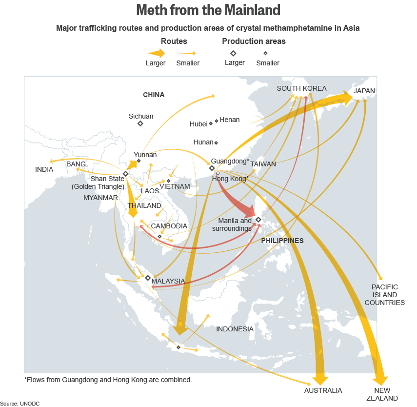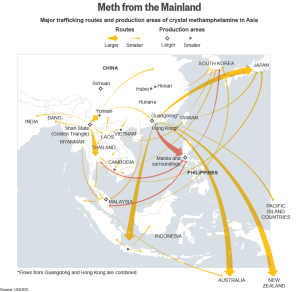 Pour autant, la géopolitique de la drogue en Asie du SudEst n’est pas un domaine forclos. Des guérillas et des mafias restent actives dans le triangle d’or et de nouveaux barons de la drogue, tel le sino-birman Wei Shao Kang, à la tête de la United Wa State Army, une nouvelle guérilla fédérant cette fois l’ethnie Wa, ont mis en place dès les années 1990 des laboratoires de drogues de synthèse. L’ecstasy et surtout la méthamphétamine (yaa baa), après avoir saturé le marché thaïlandais, déferlent désormais sur toute l’Asie…