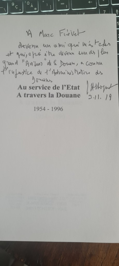 Relisant ces jours derniers « Au service de l’Etat – A travers la Douane « , j’ai relu la dédicace qu’il me fit.